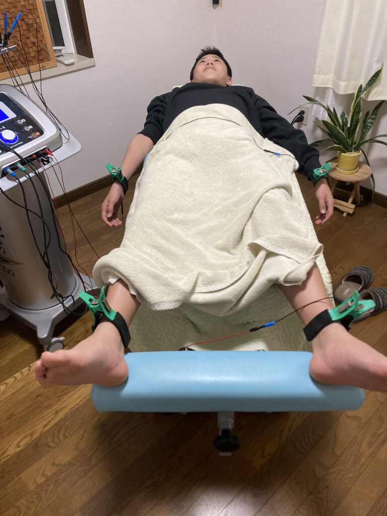 写真のように手足にクッリプをつけて微弱電流を流します。
